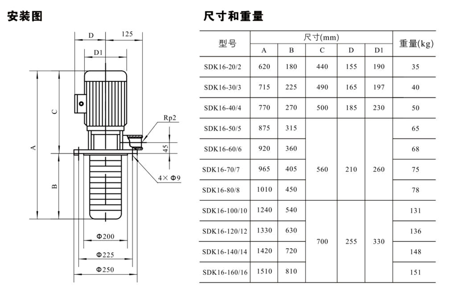 SDK16/SDKT16為配用標準電機的非自吸立式多級離心泵,電機軸和泵軸用聯軸器直接聯接的結構。為滿足水槽或容器的安裝深度,可安裝空套的腔體來改變泵本身的侵入 深度。